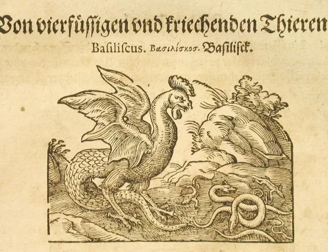 Según Plinio el viejo en su libro Naturalis historia, el basilisco, una letal criatura reptiliana capaz de matar con la mirada, solo puede ser derrotado con el canto del gallo, que lo aterroriza, o con una comadreja, la cual es el único animal capaz de vencerlo con su olor, aunque muera ella también en la lucha.